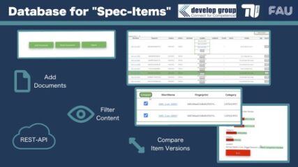 | Project mission | Maintaining SpecItems is simplified by creating an online database with a browser-based frontend. The user is able to view the SpecItems in the browser. They can also search for specific SpecItems.Moreover, the user can change SpecItems in the web browser. So in other words the database (service) shall allow to: – import new revisions of SpecItems from input files – search and view SpecItem data in web-browser – compare revisions of a SpecItem – edit specific SpecItem metadata in web-browser – export SpecItem data to output files – trigger the actions above by REST API. |